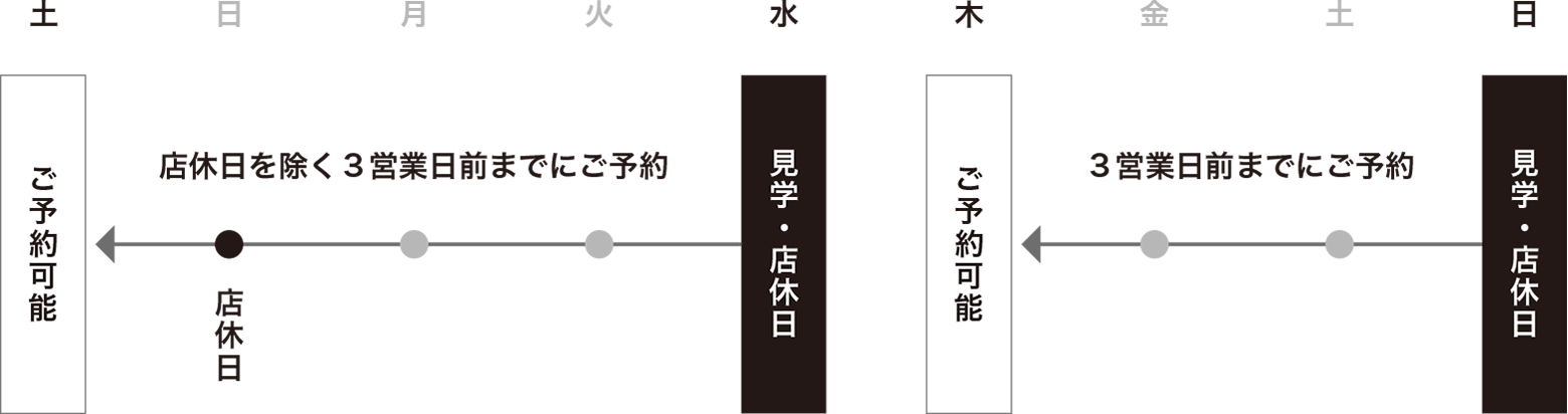 お休みの3営業日前までのご予約をお願いいたします。(店休日:日・祝・水)